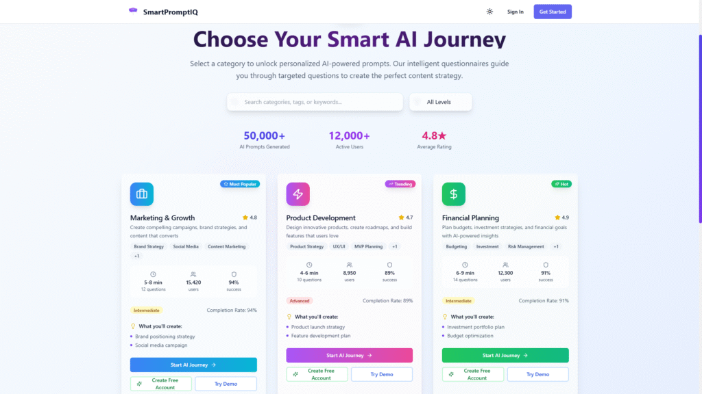 - TechFlow Inc.: “SmartPromptIQ transformed our marketing strategy development from weeks to hours. Our conversion rates increased by 340% in just 3 months.”