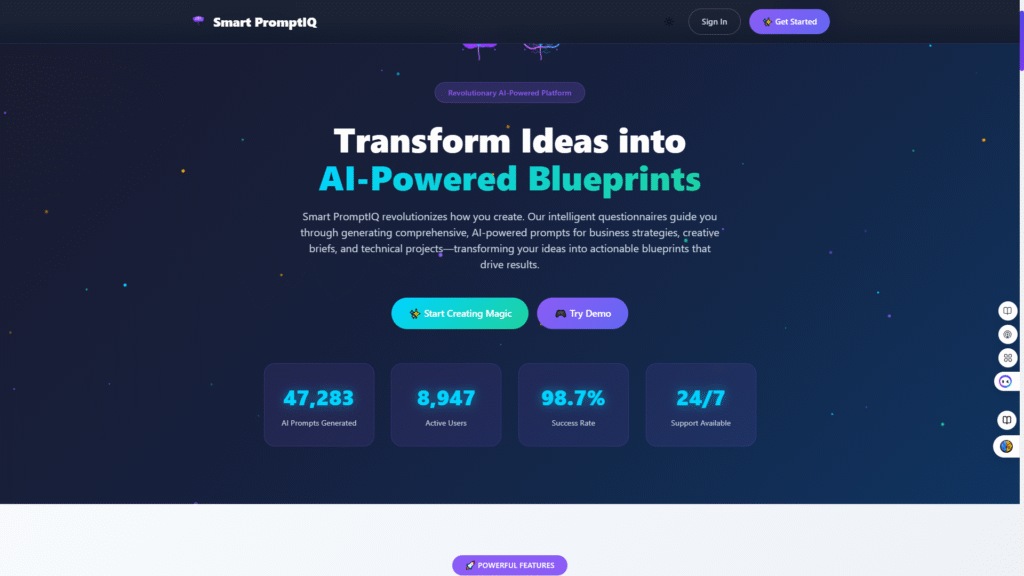 Ready to transform your creative process? Join thousands of innovative professionals and businesses already using Smart PromptIQ. Create a free account today and enjoy full access to all features with 10 free AI prompts—no credit card required. Or try the demo to experience the magic firsthand.